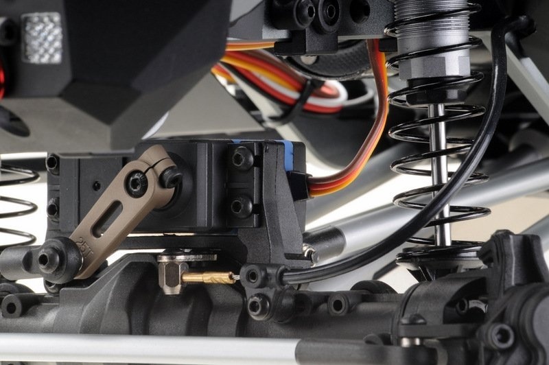 V modelu je nainstalované 20kg digitální servo řízení s kovovými převody a 3x mini servo s tahem 0,9 kg pro ovládání převodovky a uzávěrek diferenciálů. Všechna serva jsou voděodolná.