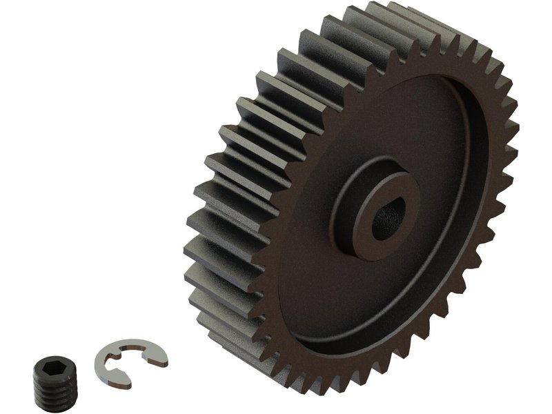 Arrma ocelový pastorek 38 zubů, modul M1, otvor Safe-D5. Otvor ve tvaru 'D' odpovídá profilu hřídele motoru s hřídelí 5mm a drážkou, proto se nemůže pastorek na hřídeli protočit. Stavěcí šroub - M4 x 4mm, segrovka 3,2mm. Precizně vyrobený široký profil zubu pro hladký chod.