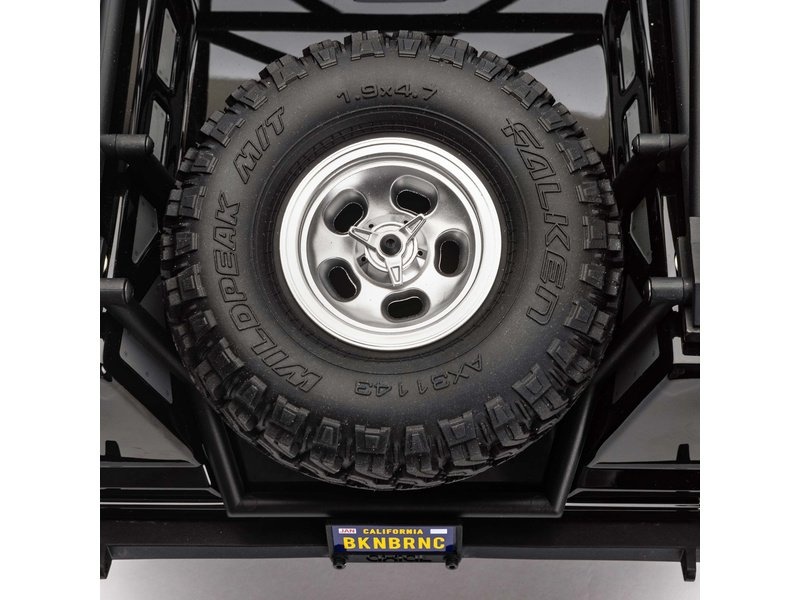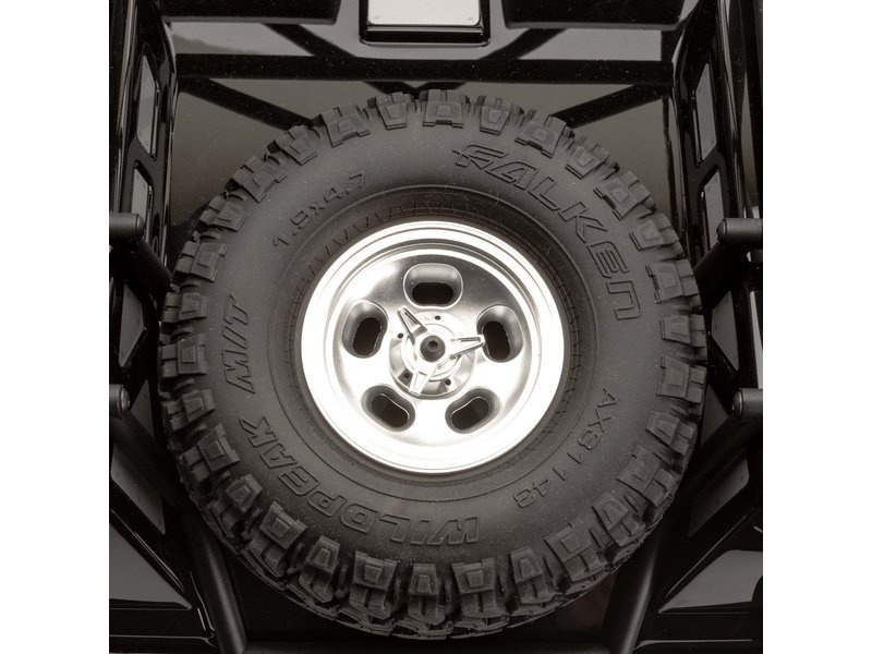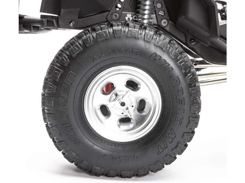Repliky pneumatik Falken Wildpeak M/T 1.9 jsou realistické a mají a výbornou přilnavost pro lezení po skalách a kopcích. Auto má také rezervní pneumatiku Axial®, připravenou k použití.