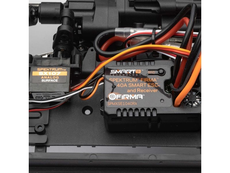 Plně sestavený RC model auta RTR je dodáván s vysílačem Spektrum™ DX3™ s exkluzivní technologií DSMR® pro vynikající dosah, odezvu a odolnost proti rušení. Je také kompatibilní s telemetrií SMART díky nainstalovaným komponentům, regulátoru Spektrum Firma™ Smart 40A a přijímačem. Pomocí sady LiPol baterií Spektrum Smart můžete sledovat kapacitu baterie na monitoru vysílače při jízdě za každého počasí a různých podmínek na trase - elektronika je chráněna voděodolným nástřikem.