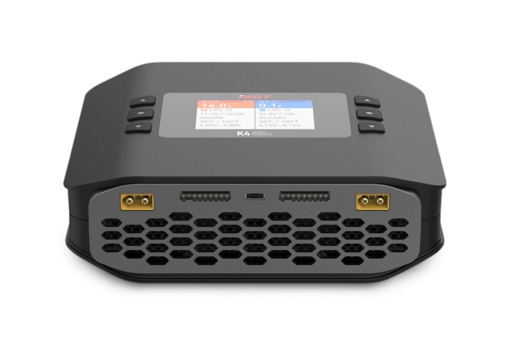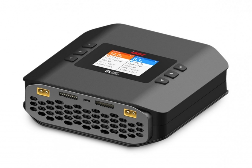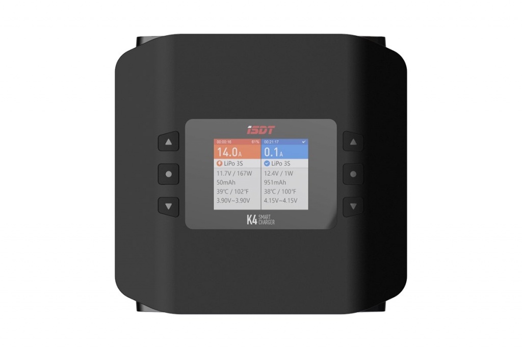 Vysokovýkonný dvoukanálový nabíječ ISDT K4 2x600W je inteligentní nabíječ s napájením ze sítě i autobaterie a velmi jednoduchou a přehlednou obsluhou. K4 umožňuje nabíjet a vybíjet běžné typy článků (NiCd, NiMH, LiPo, LiHV, ULiHV, Li-ion, LiFe, Pb), navíc je vybaven vestavěnými osmikanálovými balancery, které zajišťují bezpečné nabíjení lithiových akumulátorů. Nabíječ je vybaven barevným LCD displejem a programovacími tlačítky, které vám poskytnou možnost komfortního a velice přehledného nastavování parametrů, řízení a sledování průběhu nabíjení/vybíjení.
