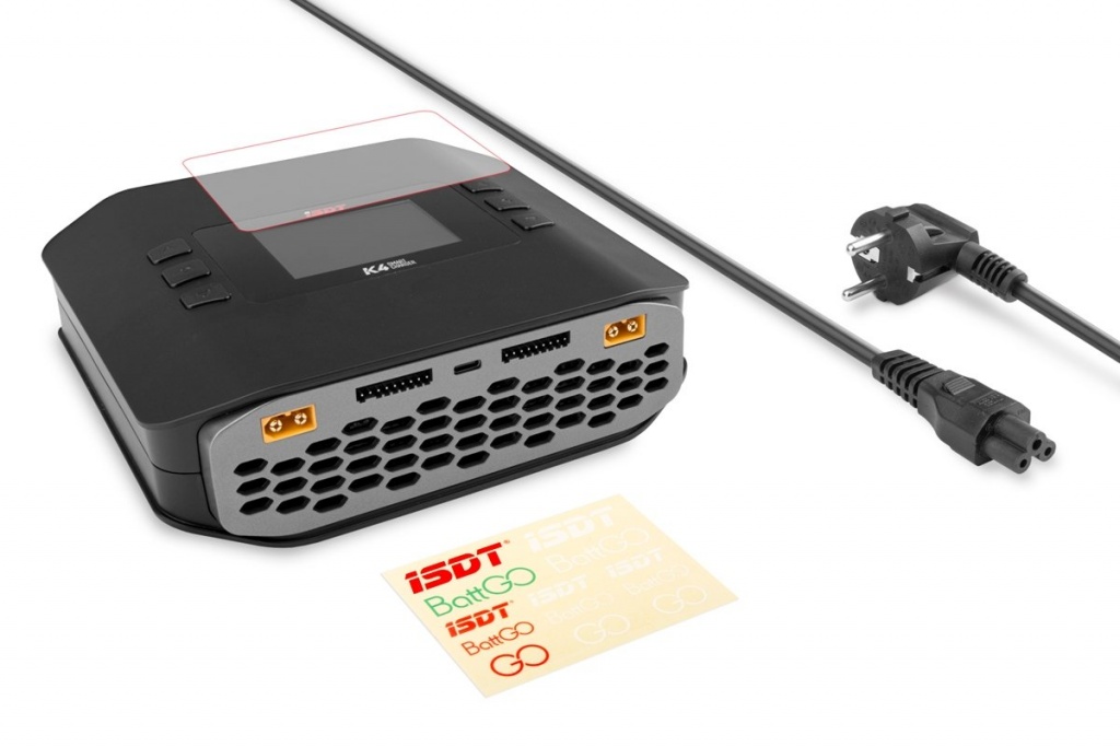 Sada nabíječe obsahuje: nabíječ ISDT K4, síťový kabel, chránič displeje, návod.