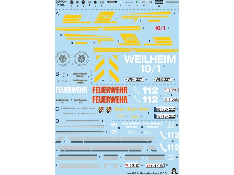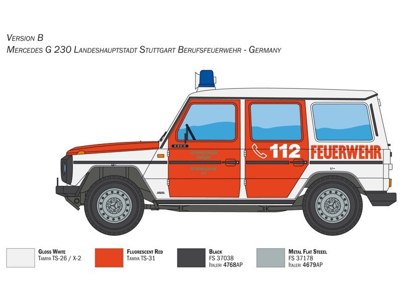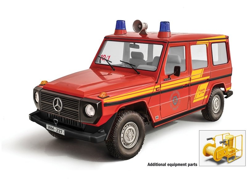 Plastikový model Italeri 3663 - auto Mercedes G230 Feuewehr v měřítku 1:24 ke slepení. Délka modelu 193 mm, obtížnost 3. Balení obsahuje OBTISKY PRO 4 VERZE. Více informací