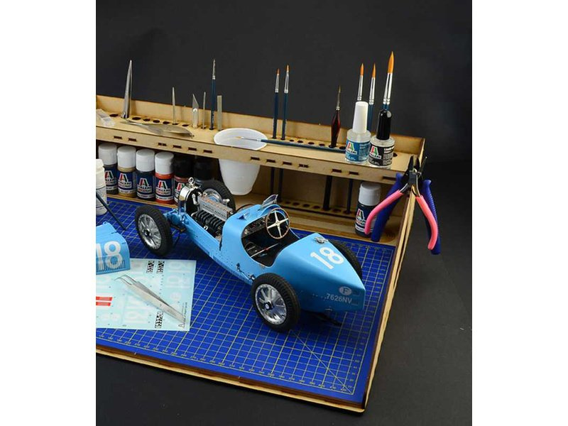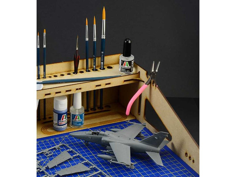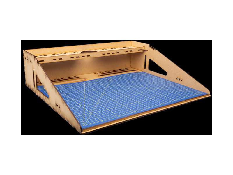 Pracovní stanice je vyrobena z laserem řezané a ořezané MDF desky. Je zde prostor pro barvy, přihrádky na nářadí, kartáče a nádobu na vodu. Rozměry: 46 x 39 x 12 cm. Více informací