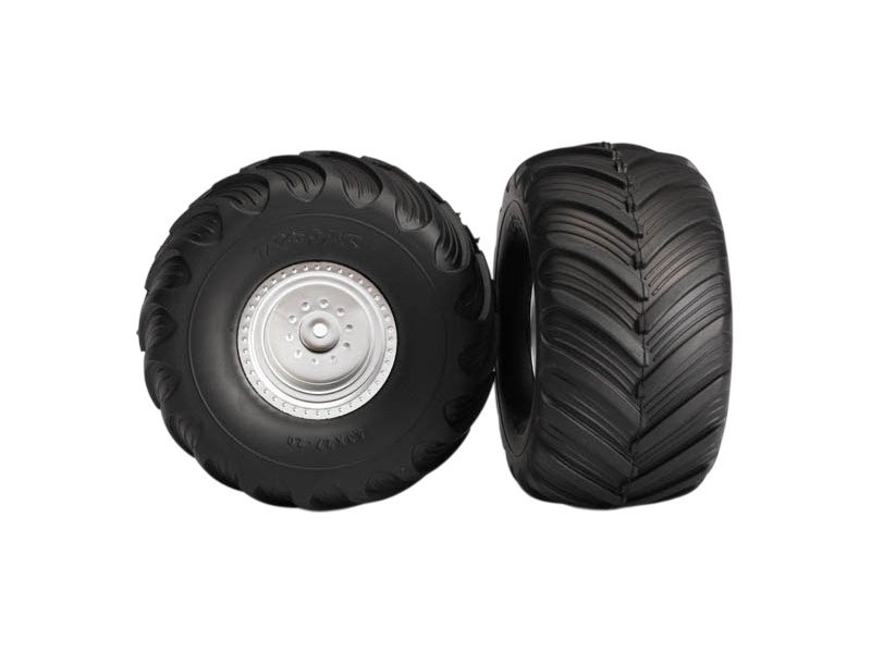 Kompletní zadní kola Traxxas Terra Groove pro RC modely aut. Disk v provedení Saténový chrom, pneumatiky Terra Groove.