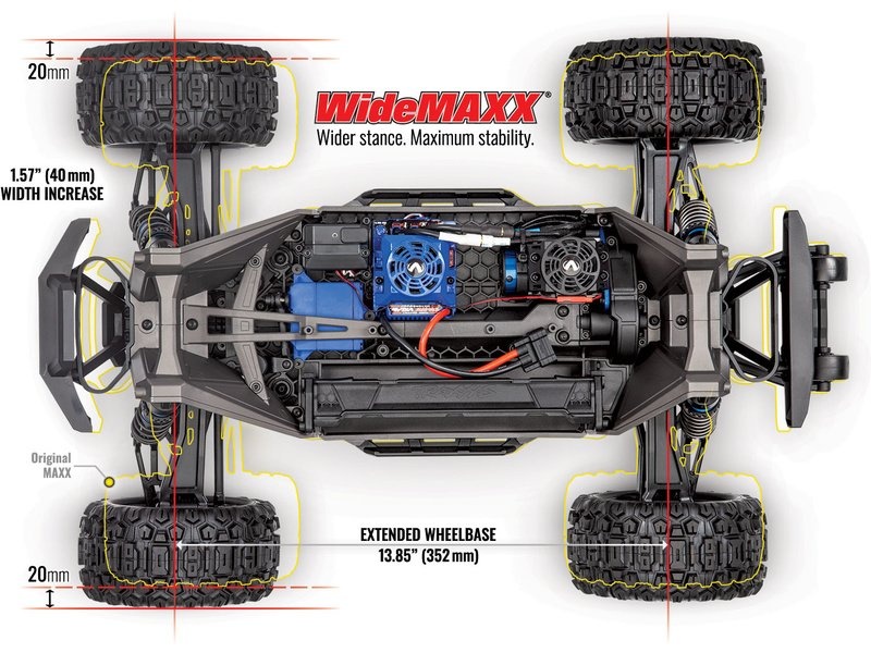 RC model auta Maxx má nově delší šasi, je vybaven sadou zavěšení kol WideMaxx pro lepší stabilitu a obsahuje upravené lože akumulátorů, díky čemuž lze použít i baterii 14.8 V 6700 mAh. Pro lepší terénní vlastnosti jsou použita nová kola a pneumatiky SledgeHammer.