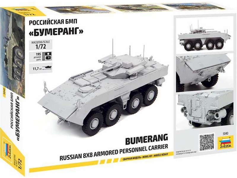 Zvezda plastikový model military BMP Bumerang 8x8 APC v měřítku 1:72 ke slepení. Stavebnice obsahuje 195 dílků, délka 117 mm.