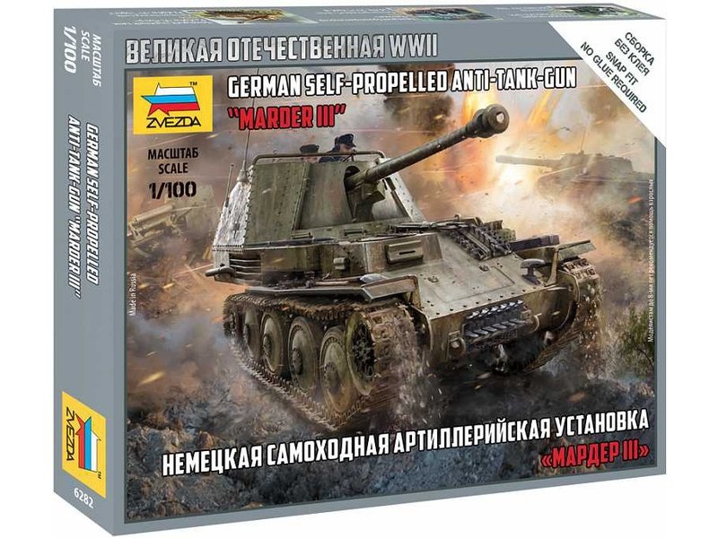 Plastikový model Zvezda 6282 - německé samohybné dělo Marder III v měřítku 1:100. Stavebnice obsahuje 18 dílků, délka 70 mm.